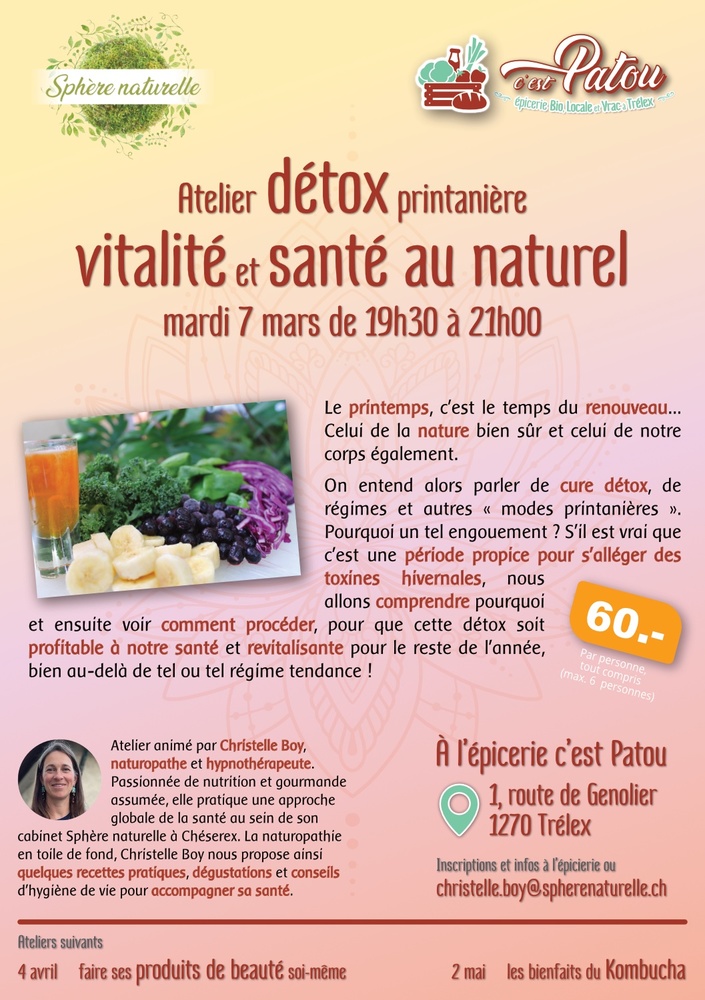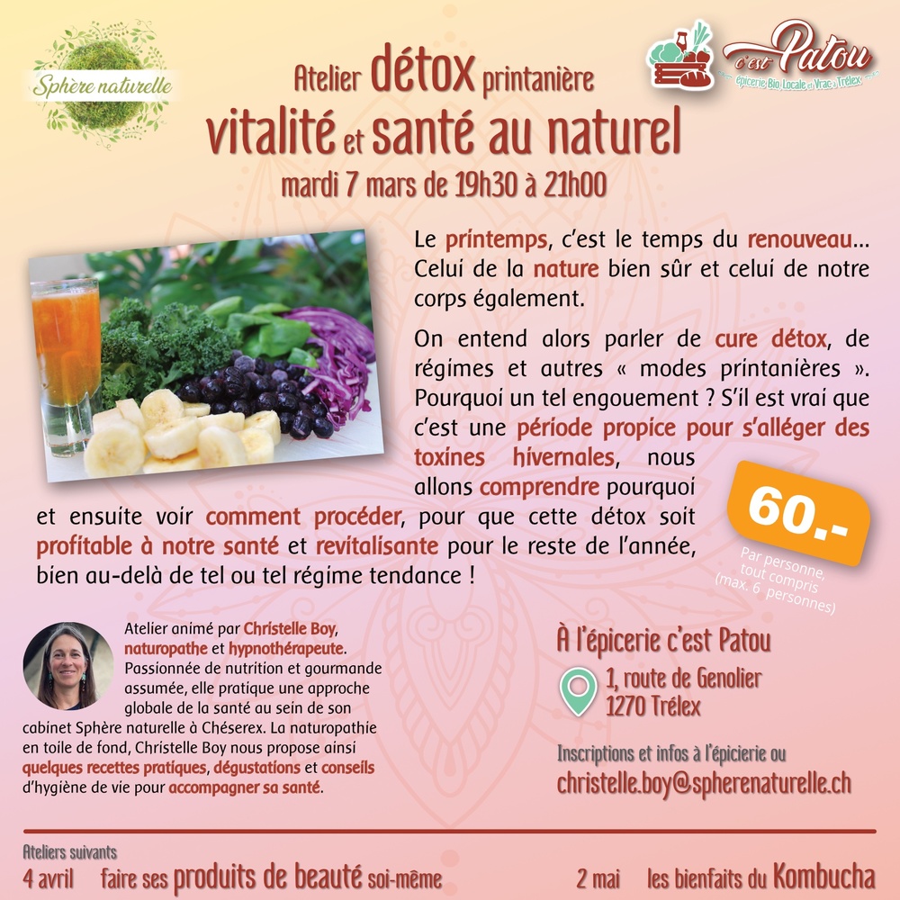 Organisation d'ateliers mensuels donnés par Christelle, une naturopathe de Chéserex. Le premier ? Détox printanière, ou comment s'alléger des toxines accumulées pendant l'hiver, pour SE ménager et prendre soin de soi avec l'arrivée des beaux jours. Cet atelier sera suivi de plusieurs autres, des produits de beauté à faire soi-même en passant par les bienfaits du Kombucha.