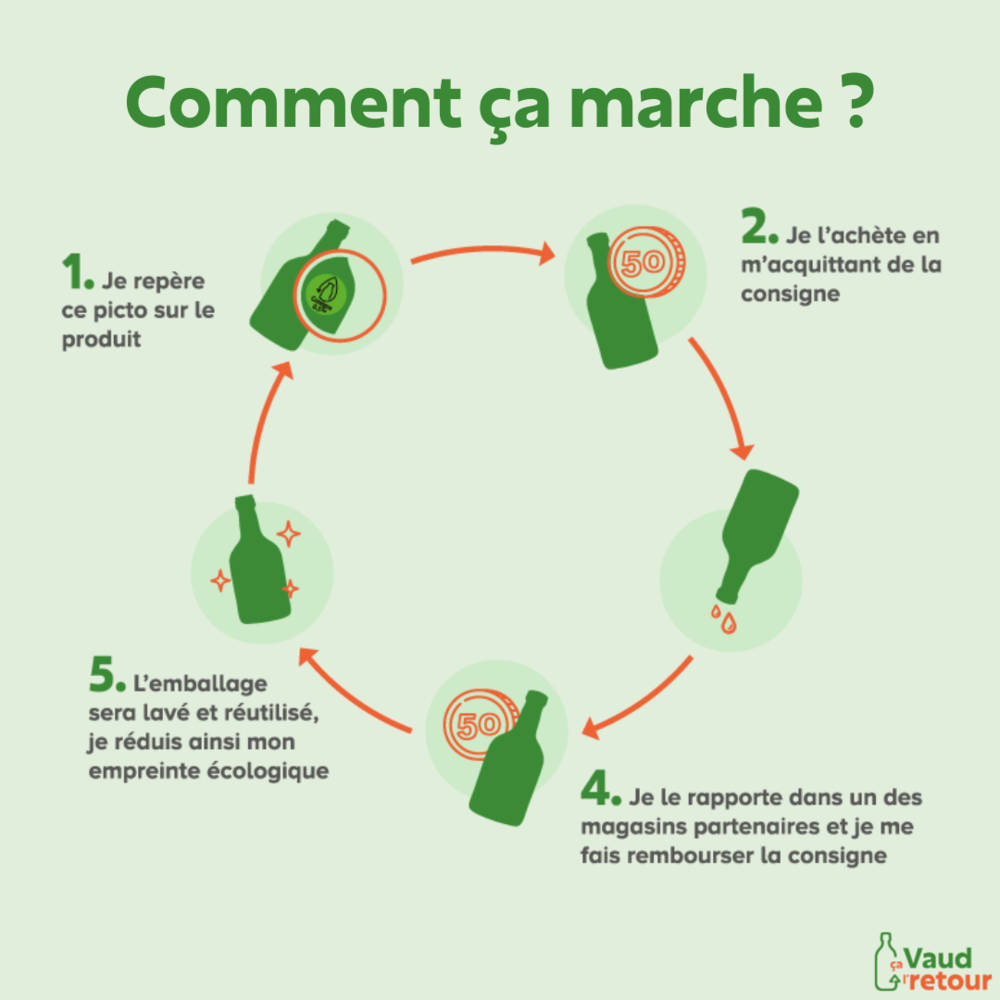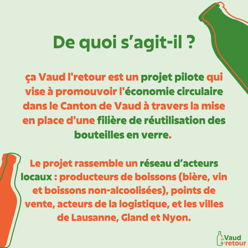 ça Vaud l’retour est un projet pilote qui vise à promouvoir l’économie circulaire dans le Canton de Vaud à travers la mise en place d’une filière de réutilisation des emballages en verre. La filière ça Vaud l’retour coordonne un réseau d’acteurs locaux: producteurs de boissons (bière, vin et boissons non-alcoolisées), points de vente et acteurs de la logistique. Le pilote consiste à développer autour des communes de Lausanne, Gland et Nyon un réseau de vente, de collecte et de lavage à échelle réduite afin de démontrer la faisabilité, l’efficacité et la rentabilité d’une telle organisation.